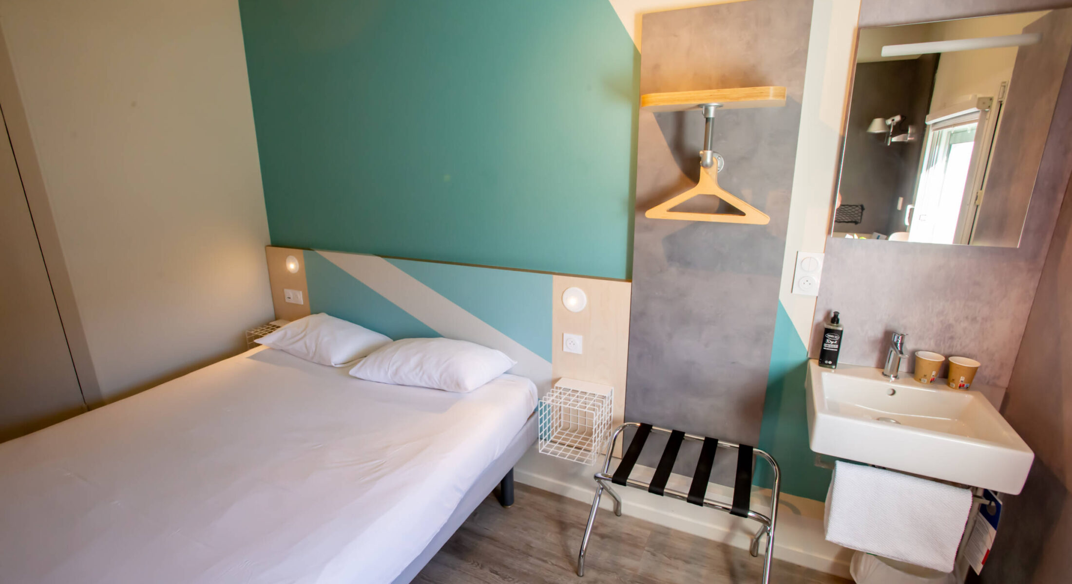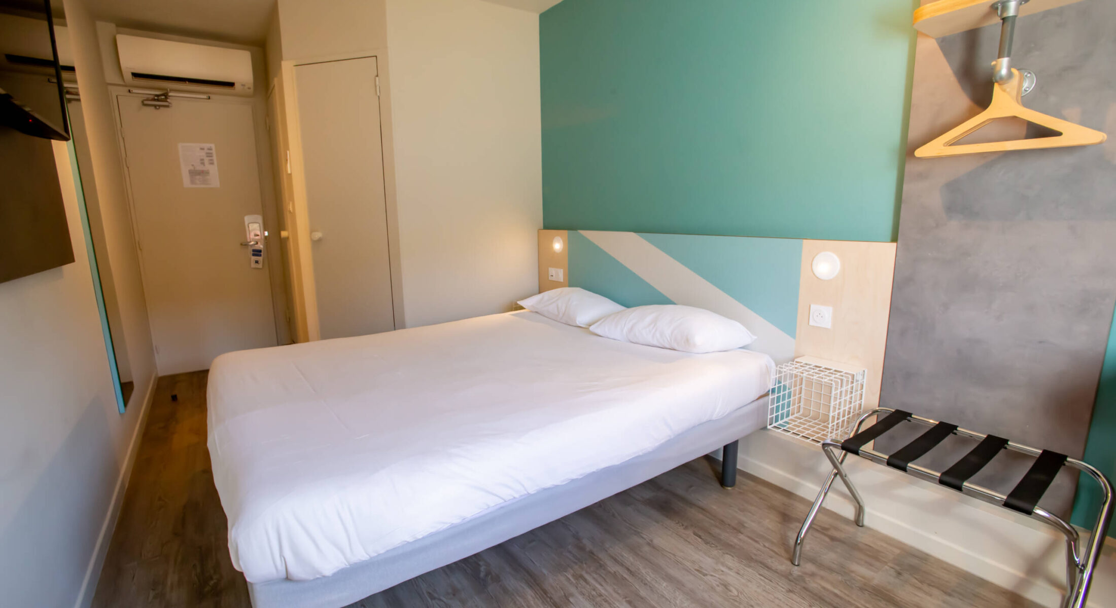 Chambre équipée d’un lit double avec une couette douillette, d’une cabine de douche spacieuse et de toilettes. Profitez de la TV écran plat avec de nombreuses chaînes (dont beIN Sports), de connexions multimédia et du Wifi fibre ultra haut débit.